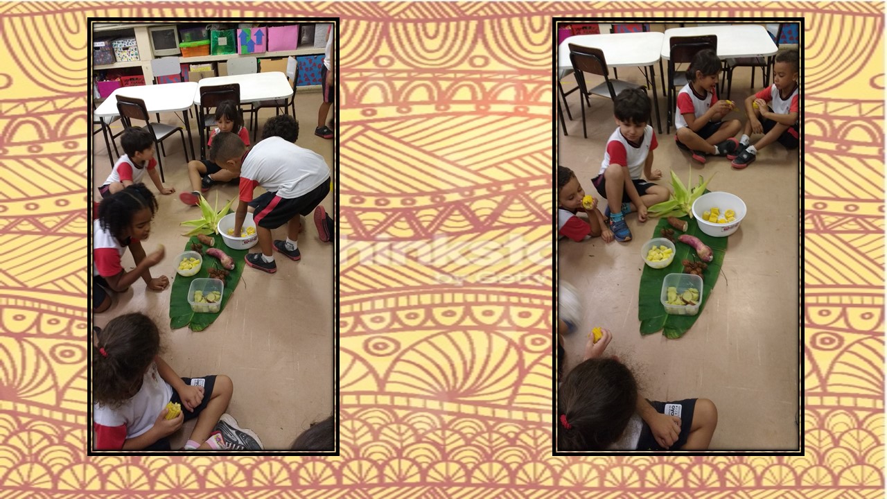 Na sala de aula, em uma roda de conversa conversamos sobre alguns costumes indígenas e sobre a sua alimentação. Apresentei as crianças primeiramente uma folha de bananeira e todos com muita curiosidade quiseram manuseá-la, ficaram tão encantados com o que estavam tocando que pediram pra levar um pedaço para casa. Em roda, lembrei da mandioca que tínhamos conhecido sobre a sua lenda e ofereci as crianças o alimento cozido, muitos estavam experimentando pela primeira vez. A batata doce também foi apresentada para as crianças, apreciamos ela crua e a saboreamos cozida com casca ou sem casca.Houve crianças que não gostaram do sabor ou até mesmo não aceitaram o alimento. Em seguida, apresentei a espiga de milho e depois a abrimos para verem como era por dentro e por fora o saboroso alimento. Expliquei sobre os famosos "cabelinhos" e mencionei que antigamente, muitas crianças faziam bonecas com as espigas de milho. Mostrei também que havia uma larvinha dentro da espiga e que isso poderia acontecer às vezes, algumas crianças expressaram aflição ao verem aquilo. A sensação do momento foi saborearem o milho cozido, as crianças se deliciaram.